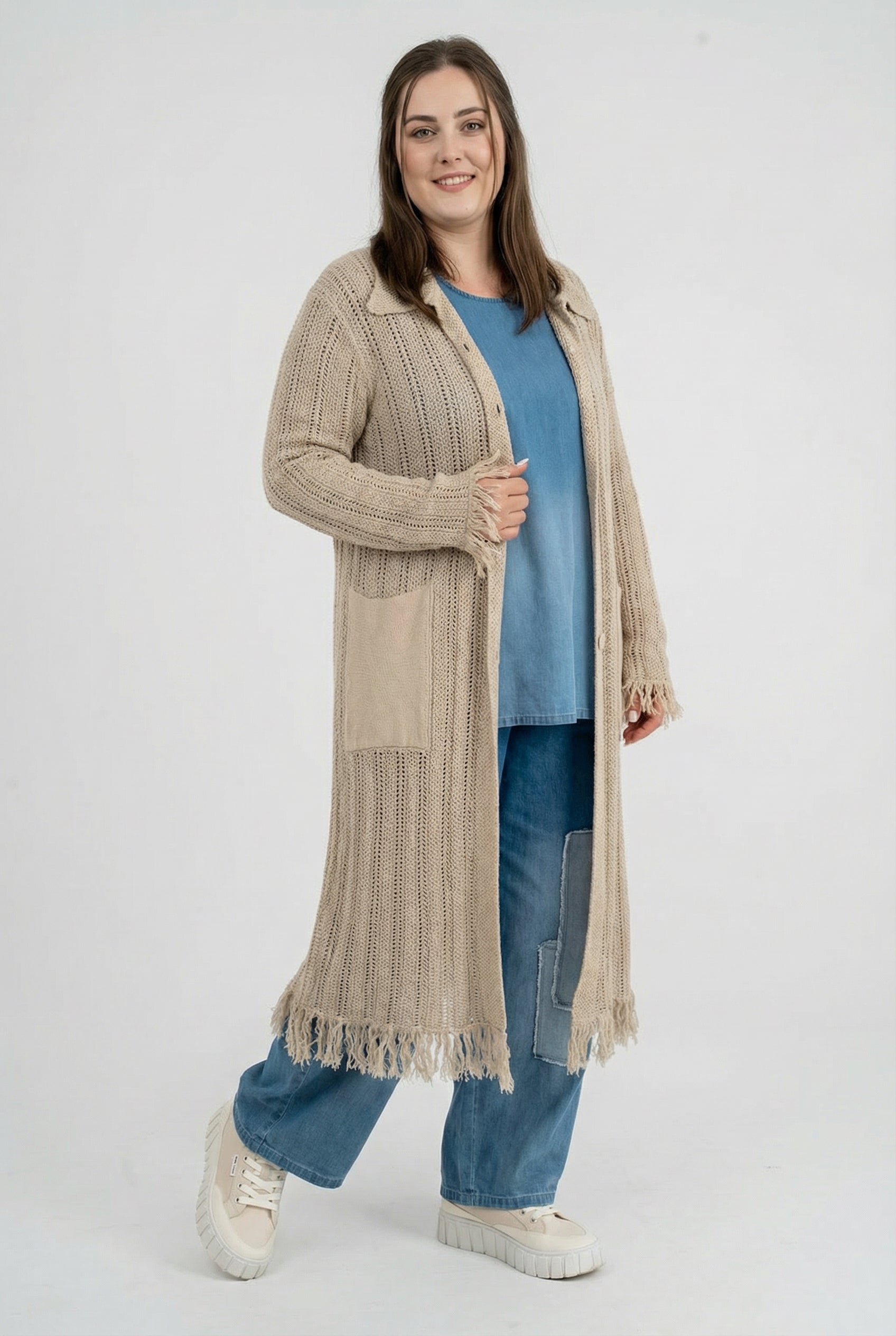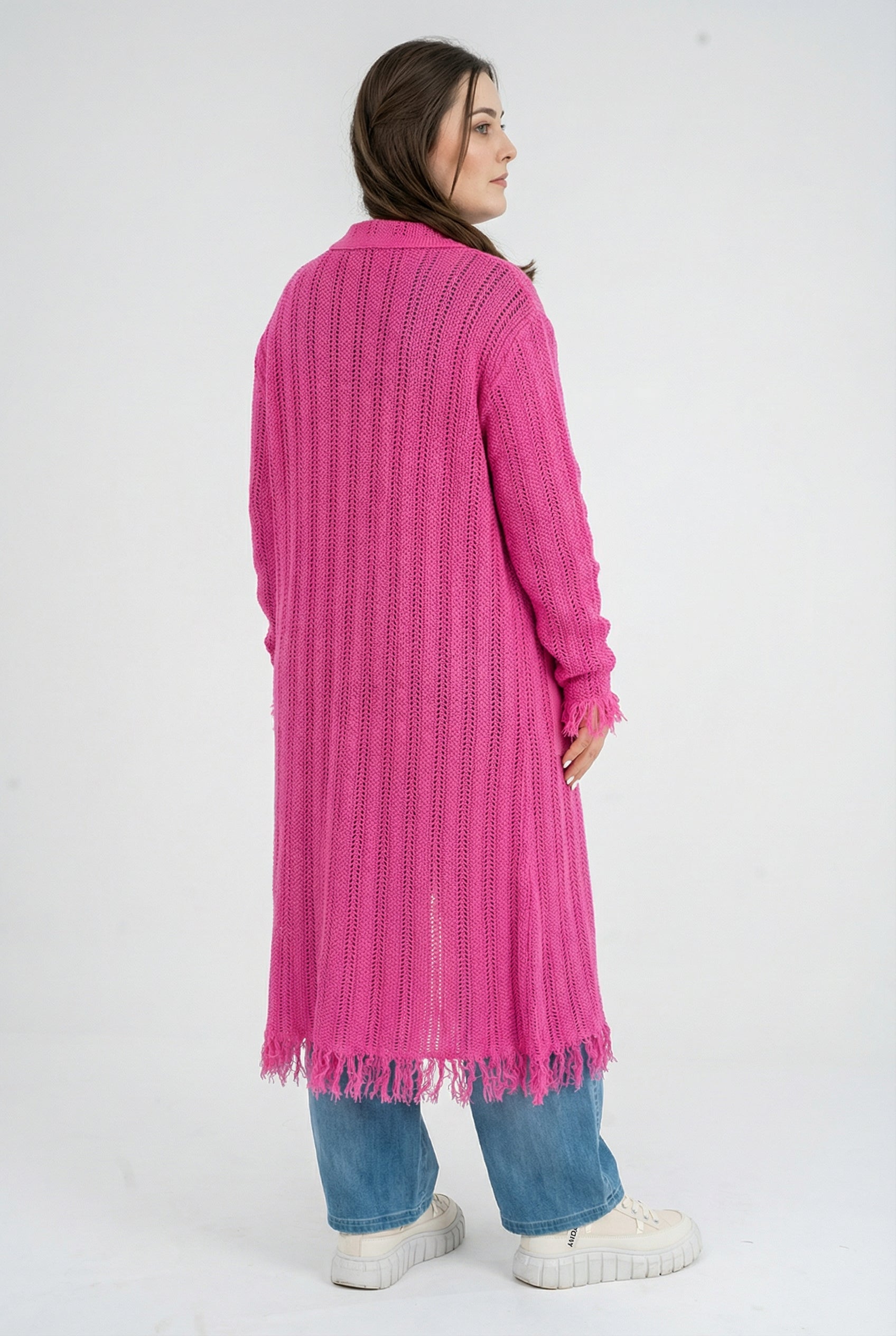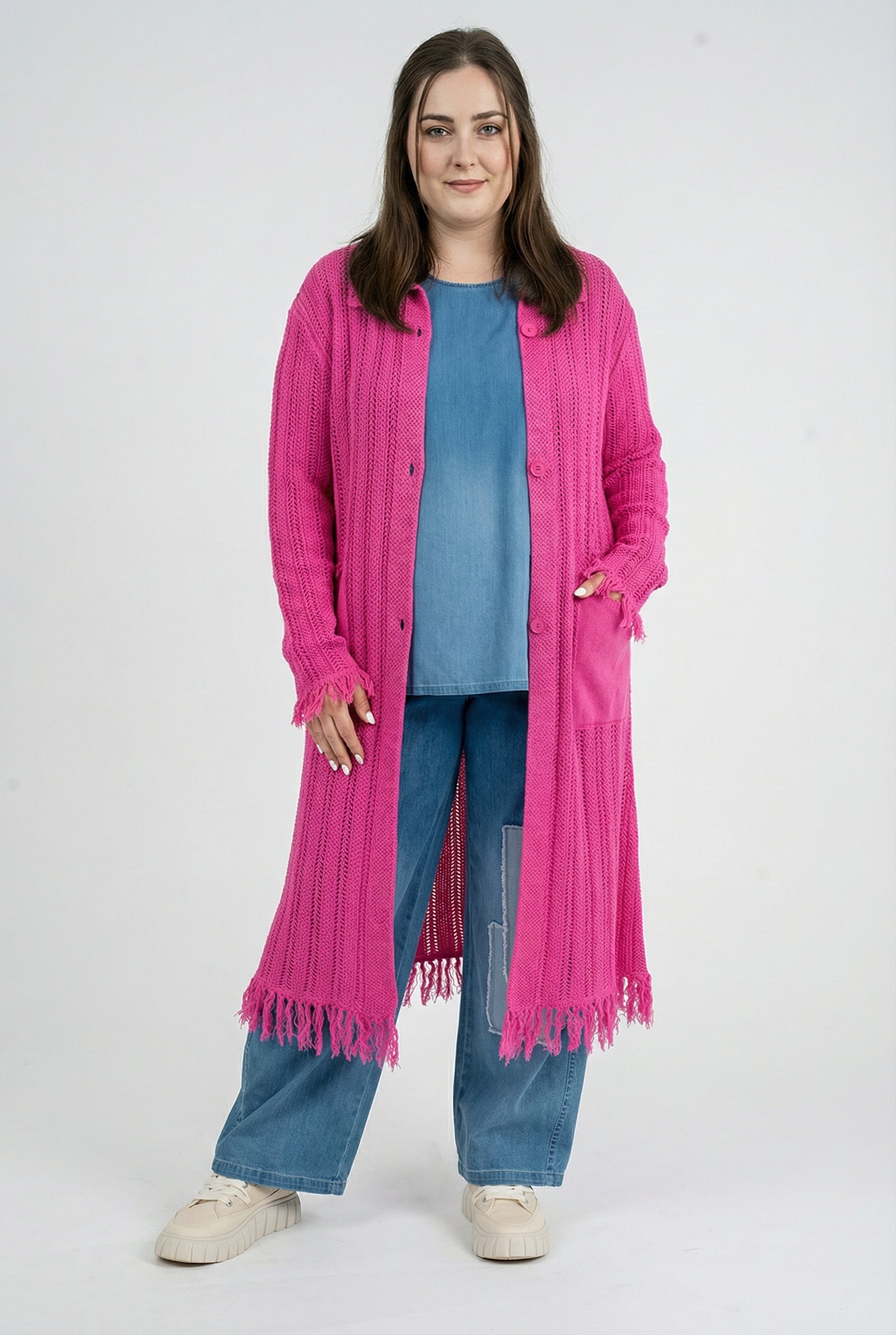 Der offene Baumwollstrick sorgt für Atmungsaktivität und ein unkompliziertes Tragegefühl. Die lange, gerade Form streckt optisch, während der Hemdkragen und die durchgehende Knopfleiste der Jacke eine saubere Linie geben. Aufgesetzte Taschen bieten Platz für Essentials. Fransige Abschlüsse an Saum und Ärmeln setzen einen entspannten Akzent – in Beige wirkt die Jacke natürlich, in Pink zum echten Blickfang.